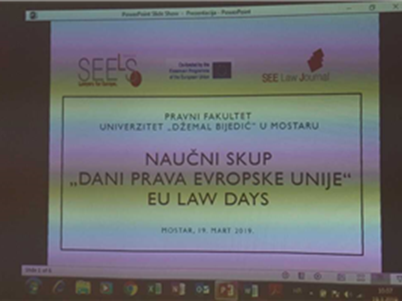 Na Pravnom fakultetu Univerziteta „Džemal Bijedić" u Mostaru 19.3.2019. godine održan je naučni skup Dani prava EU, koju Pravni fakultet održava u saradnji sa Mrežom pravnih fakulteta Jugoistočne Evrope (SEELS), a u okviru projekta"Jačanje studija prava Evropske unije u zemljama Jugoistočne Evrope”.
